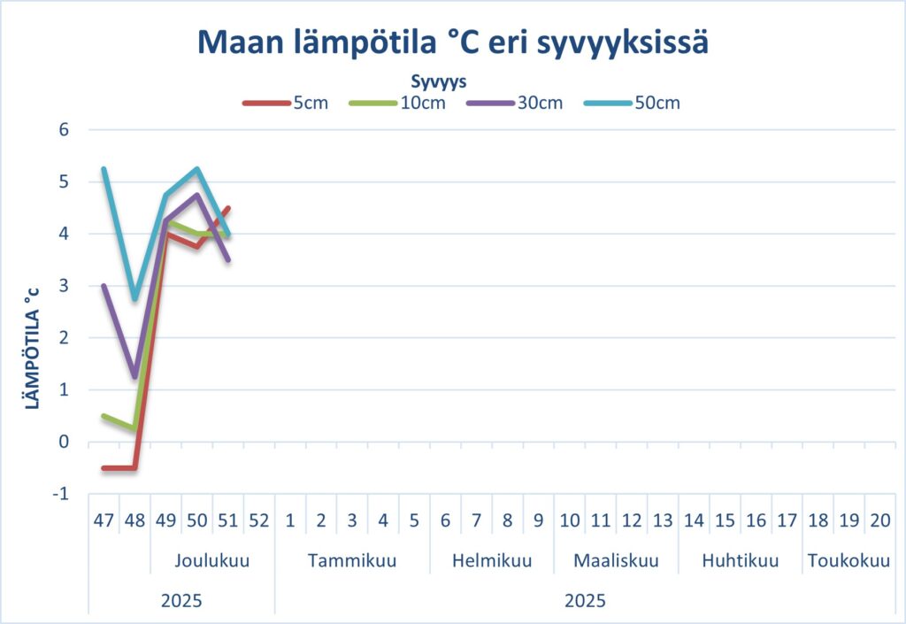Lumipeitteen korkeus, roudan syvyys ja maan lämpötila ºC kynnetyllä koelohkolla Paimiossa 17.12.2025. Ei routaa eikä lunta. Routa ja lumipeitteen korkeus ovat viiden mittauspisteen keskiarvotuloksia.